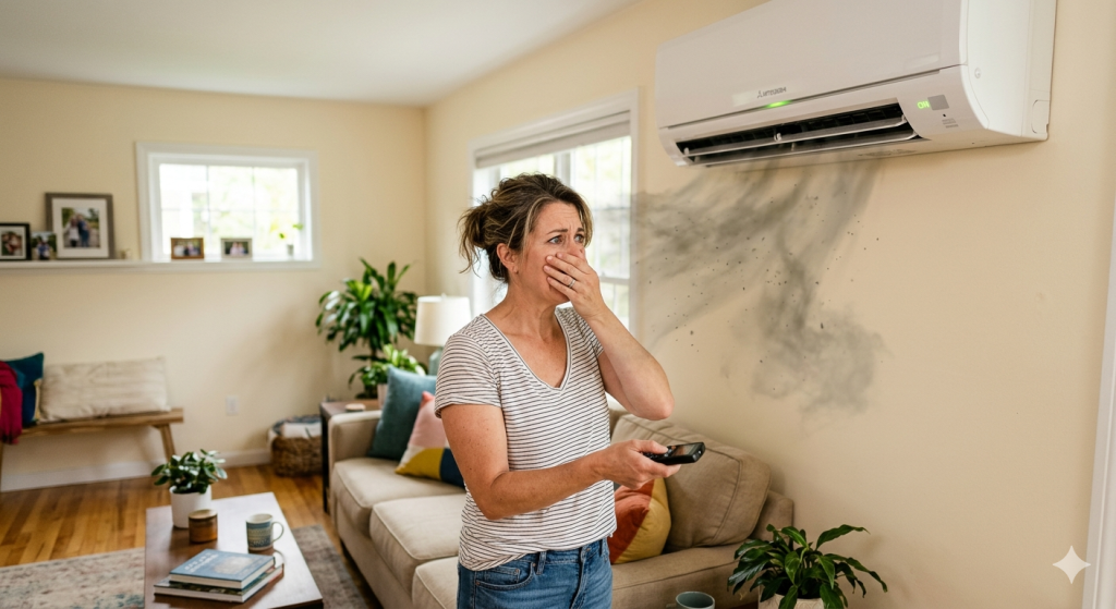When the AC starts, air passes over that damp surface and pushes the smell through the vents. This is one of the most common reasons homeowners notice a mildew smell from the air conditioner right when cooling begins.